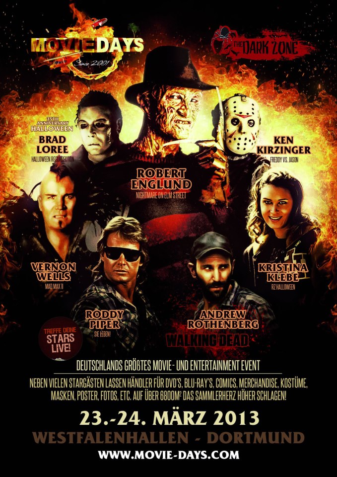 Bald ist es wieder soweit und „Movie Days/Dark Zone“ öffnen zum zweiten Mal in Nordrhein-Westfalen die Tore für Film- und Serienfans aus ganz Europa. Nachdem die Veranstaltung im Februar 2012 in Mülheim an der Ruhr (Leinwandreporter berichtete) sehr gut besucht worden war, entschlossen sich die Veranstalter Angelo Zannin und Eric Branden, für 2013 ein noch größeres Event zu planen. Aus diesem Grund haben sie die Dortmunder Westfalenhallen angemietet, wo auf der kompletten Fläche sich alles um das Thema Film drehen wird.